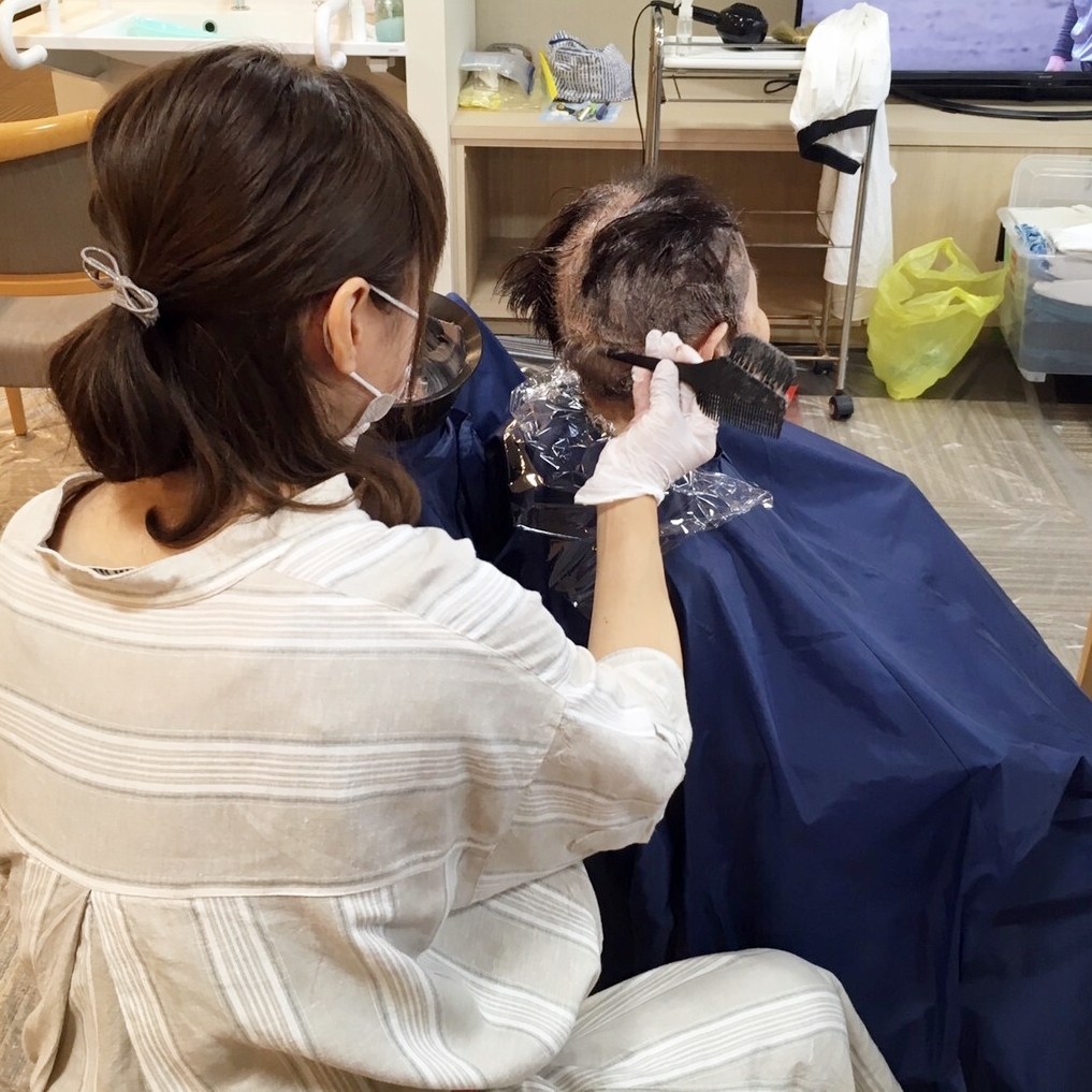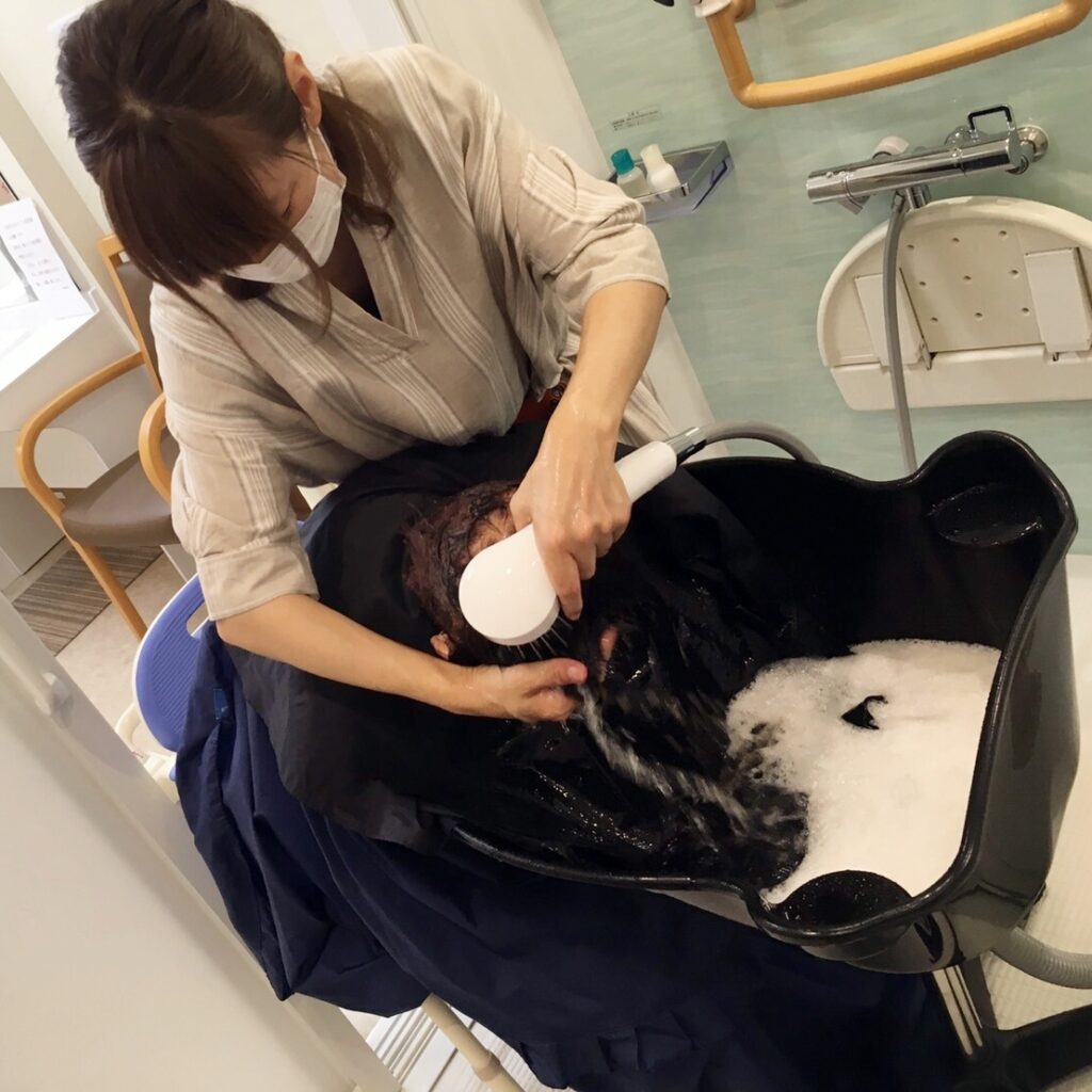 ▼ 移動式シャンプー台や自宅・施設でのカットや毛染めなど、どこでもヘアーサロンと変わらないサービスをお届け
